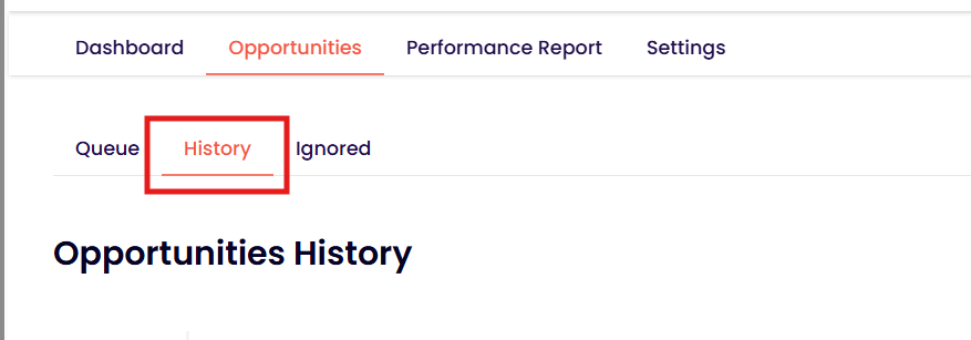 The 'History' Tab in Opportunities displays a list of all previous Opportunities generated for this Paid Ads Profile, the date of their last status change and their final status
